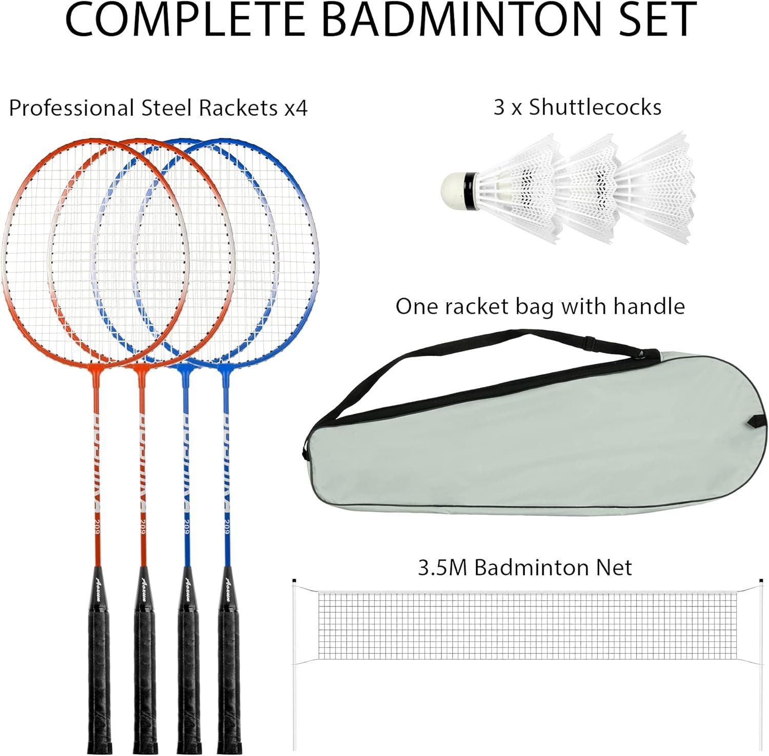 - ALL IN ONE SET – The badminton set contains 4 x light badminton rackets, 3 x shuttlecocks, 6 x height-adjustable net holders, 1 x reinforcement rope, 1 x badminton net, 4 x ground reinforcement stud and 1 x portable carry bag.